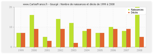 - Gourgé en 2008 : 20 naissances et 5 décès