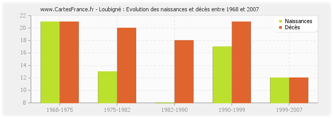 Loubigné : évolution des naissances et décès de 1968 à 2007