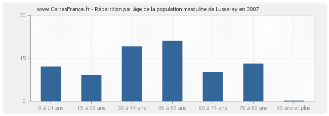 Répartition de la population masculine de Lusseray par âge en 2007 :