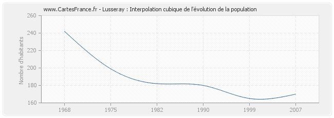 Cette courbe reprend l'historique de la population de Lusseray de 1968 à 2007 en interpolation cubique. Ceci permet d'obtenir plus précisément la population de la commune de Lusseray les années ou aucun recensement n'a été effectué.