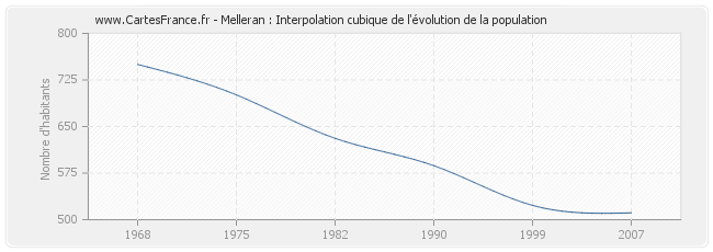 Cette courbe reprend l'historique de la population de Melleran de 1968 à 2007 en interpolation cubique. Ceci permet d'obtenir plus précisément la population de la commune de Melleran les années ou aucun recensement n'a été effectué.