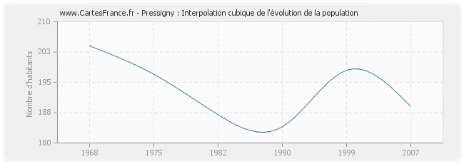Cette courbe reprend l'historique de la population de Pressigny de 1968 à 2007 en interpolation cubique. Ceci permet d'obtenir plus précisément la population de la commune de Pressigny les années ou aucun recensement n'a été effectué.