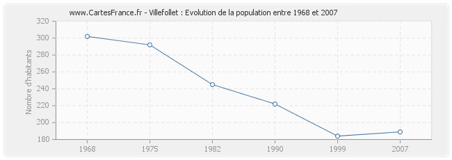 La population de Villefollet était de 189 habitants en 2007, 184 habitants en 1999, 222 habitants en 1990, 245 habitants en 1982, 292 habitants en 1975 et 302 habitants en 1968.