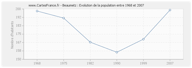 La population de Beaumetz était de 199 habitants en 2007, 170 habitants en 1999, 157 habitants en 1990, 167 habitants en 1982, 191 habitants en 1975 et 198 habitants en 1968.