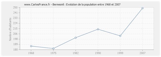 Cette courbe reprend l'historique de la population de Bermesnil de 1968 à 2007 en interpolation cubique. Ceci permet d'obtenir plus précisément la population de la commune de Bermesnil les années ou aucun recensement n'a été effectué.