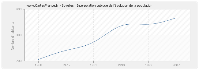Cette courbe reprend l'historique de la population de Bovelles de 1968 à 2007 en interpolation cubique. Ceci permet d'obtenir plus précisément la population de la commune de Bovelles les années ou aucun recensement n'a été effectué.