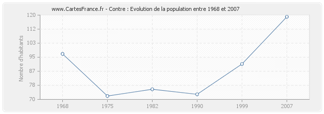 La population de Contre était de 119 habitants en 2007, 91 habitants en 1999, 73 habitants en 1990, 76 habitants en 1982, 72 habitants en 1975 et 97 habitants en 1968.