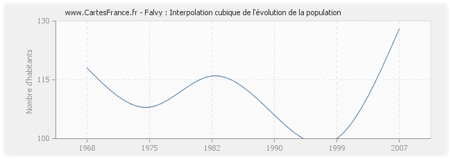 Cette courbe reprend l'historique de la population de Falvy de 1968 à 2007 en interpolation cubique. Ceci permet d'obtenir plus précisément la population de la commune de Falvy les années ou aucun recensement n'a été effectué.