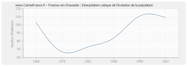 Cette courbe reprend l'historique de la population de Fresnoy-en-Chaussée de 1968 à 2007 en interpolation cubique. Ceci permet d'obtenir plus précisément la population de la commune de Fresnoy-en-Chaussée les années ou aucun recensement n'a été effectué.
