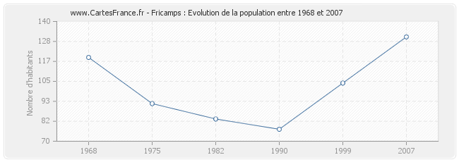 Cette courbe reprend l'historique de la population de Fricamps de 1968 à 2007 en interpolation cubique. Ceci permet d'obtenir plus précisément la population de la commune de Fricamps les années ou aucun recensement n'a été effectué.
