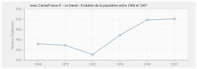 La population de Le Hamel était de 521 habitants en 2007, 519 habitants en 1999, 489 habitants en 1990, 451 habitants en 1982, 469 habitants en 1975 et 472 habitants en 1968.