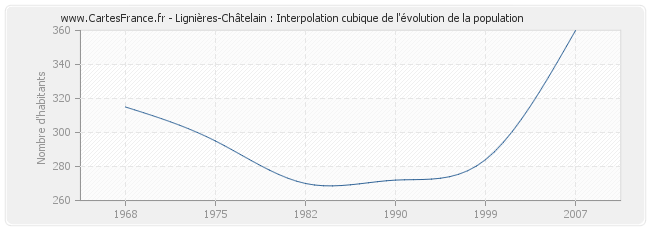 Cette courbe reprend l'historique de la population de Lignières-Châtelain de 1968 à 2007 en interpolation cubique. Ceci permet d'obtenir plus précisément la population de la commune de Lignières-Châtelain les années ou aucun recensement n'a été effectué.