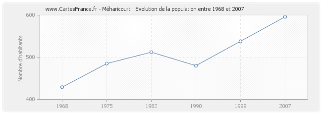 La population de Méharicourt était de 596 habitants en 2007, 538 habitants en 1999, 480 habitants en 1990, 512 habitants en 1982, 485 habitants en 1975 et 429 habitants en 1968.