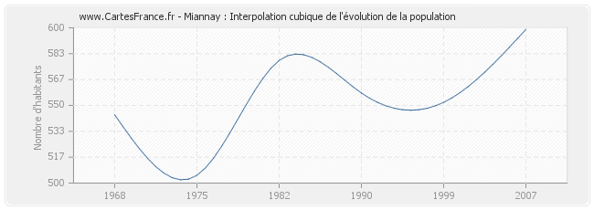 Cette courbe reprend l'historique de la population de Miannay de 1968 à 2007 en interpolation cubique. Ceci permet d'obtenir plus précisément la population de la commune de Miannay les années ou aucun recensement n'a été effectué.