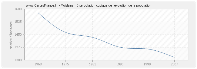 Cette courbe reprend l'historique de la population de Moislains de 1968 à 2007 en interpolation cubique. Ceci permet d'obtenir plus précisément la population de la commune de Moislains les années ou aucun recensement n'a été effectué.