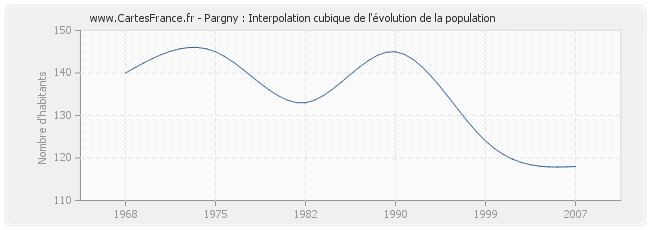 Cette courbe reprend l'historique de la population de Pargny de 1968 à 2007 en interpolation cubique. Ceci permet d'obtenir plus précisément la population de la commune de Pargny les années ou aucun recensement n'a été effectué.