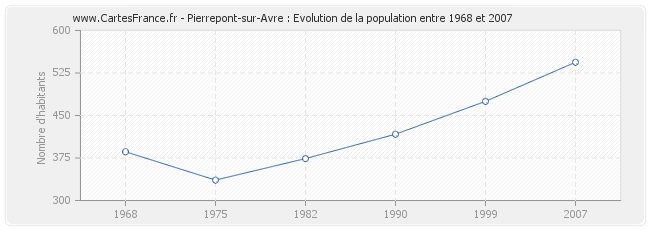 Cette courbe reprend l'historique de la population de Pierrepont-sur-Avre de 1968 à 2007 en interpolation cubique. Ceci permet d'obtenir plus précisément la population de la commune de Pierrepont-sur-Avre les années ou aucun recensement n'a été effectué.