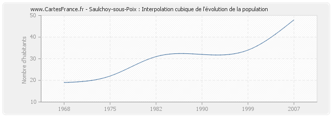 Cette courbe reprend l'historique de la population de Saulchoy-sous-Poix de 1968 à 2007 en interpolation cubique. Ceci permet d'obtenir plus précisément la population de la commune de Saulchoy-sous-Poix les années ou aucun recensement n'a été effectué.