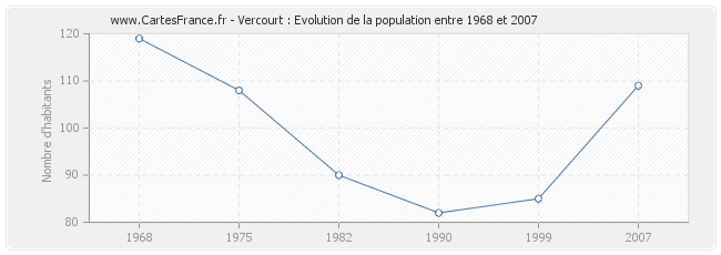 La population de Vercourt était de 109 habitants en 2007, 85 habitants en 1999, 82 habitants en 1990, 90 habitants en 1982, 108 habitants en 1975 et 119 habitants en 1968.