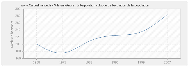 Cette courbe reprend l'historique de la population de Ville-sur-Ancre de 1968 à 2007 en interpolation cubique. Ceci permet d'obtenir plus précisément la population de la commune de Ville-sur-Ancre les années ou aucun recensement n'a été effectué.