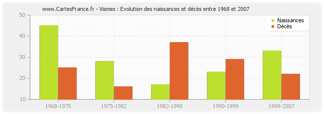 Vismes : évolution des naissances et décès de 1968 à 2007