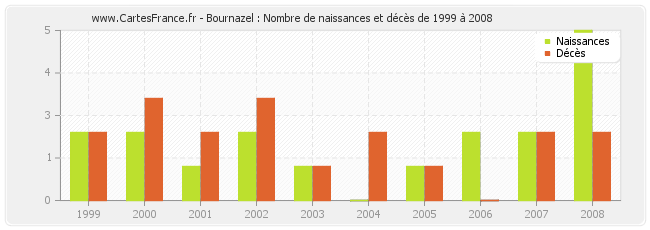 - Bournazel en 2005 : 1 naissances et 1 décès