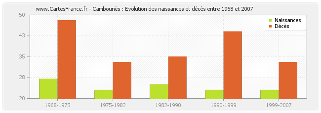 Cambounès : évolution des naissances et décès de 1968 à 2007