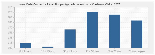 - Population de Cordes-sur-Ciel de 45 à 59 ans : 224 habitants