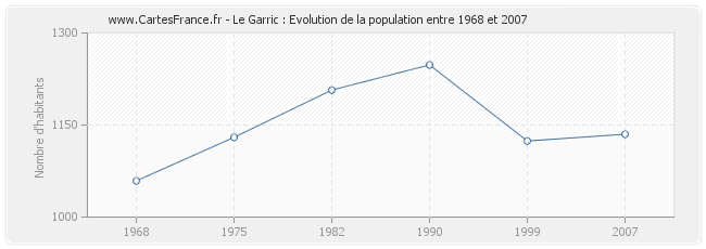 La population de Le Garric était de 1 135 habitants en 2007, 1 124 habitants en 1999, 1 248 habitants en 1990, 1 207 habitants en 1982, 1 130 habitants en 1975 et 1 059 habitants en 1968.
