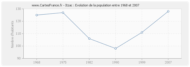 La population d'Itzac était de 128 habitants en 2007, 111 habitants en 1999, 98 habitants en 1990, 106 habitants en 1982, 127 habitants en 1975 et 125 habitants en 1968.