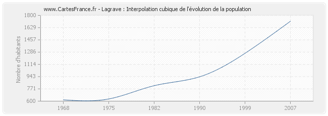 Cette courbe reprend l'historique de la population de Lagrave de 1968 à 2007 en interpolation cubique. Ceci permet d'obtenir plus précisément la population de la commune de Lagrave les années ou aucun recensement n'a été effectué.