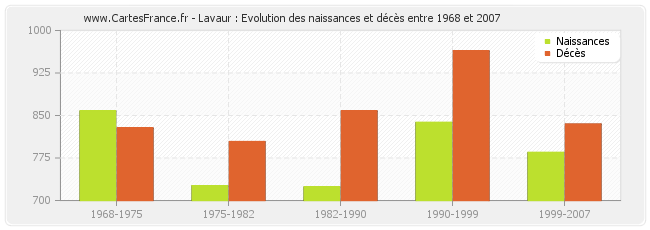 Lavaur : évolution des naissances et décès de 1968 à 2007