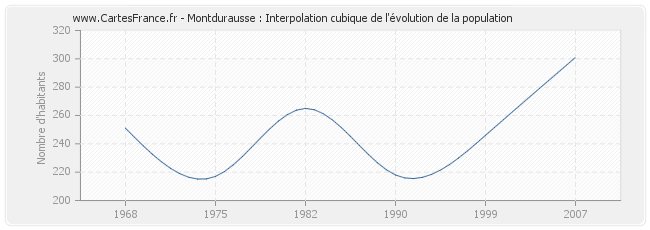 Cette courbe reprend l'historique de la population de Montdurausse de 1968 à 2007 en interpolation cubique. Ceci permet d'obtenir plus précisément la population de la commune de Montdurausse les années ou aucun recensement n'a été effectué.