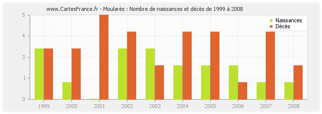 Moularès : évolution des naissances et décès de 1968 à 2007