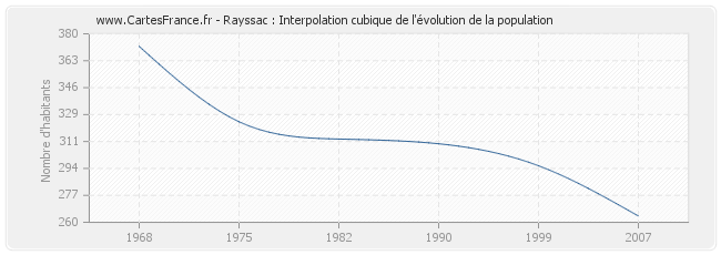 Cette courbe reprend l'historique de la population de Rayssac de 1968 à 2007 en interpolation cubique. Ceci permet d'obtenir plus précisément la population de la commune de Rayssac les années ou aucun recensement n'a été effectué.