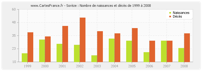 - Sorèze en 2008 : 23 naissances et 37 décès