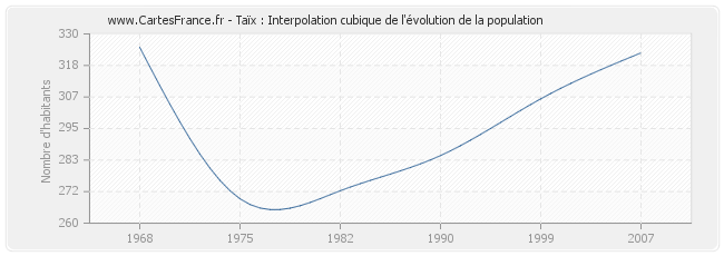 Cette courbe reprend l'historique de la population de Taïx de 1968 à 2007 en interpolation cubique. Ceci permet d'obtenir plus précisément la population de la commune de Taïx les années ou aucun recensement n'a été effectué.