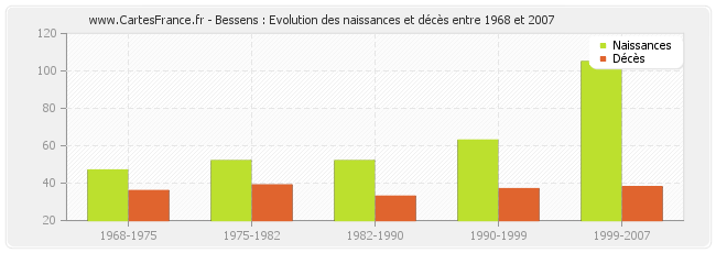 Bessens : évolution des naissances et décès de 1968 à 2007
