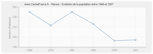 La population de Marsac était de 199 habitants en 2007, 198 habitants en 1999, 219 habitants en 1990, 234 habitants en 1982, 217 habitants en 1975 et 234 habitants en 1968.