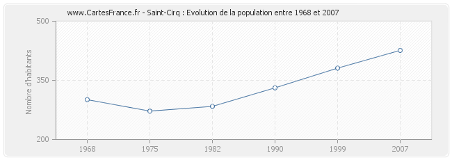 Cette courbe reprend l'historique de la population de Saint-Cirq de 1968 à 2007 en interpolation cubique. Ceci permet d'obtenir plus précisément la population de la commune de Saint-Cirq les années ou aucun recensement n'a été effectué.