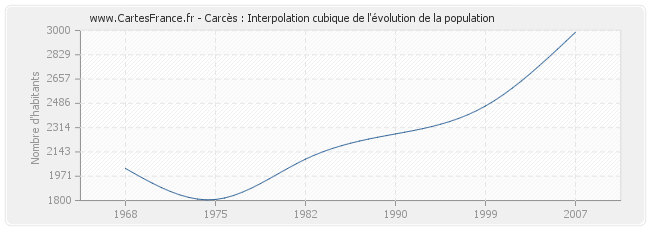Cette courbe reprend l'historique de la population de Carcès de 1968 à 2007 en interpolation cubique. Ceci permet d'obtenir plus précisément la population de la commune de Carcès les années ou aucun recensement n'a été effectué.