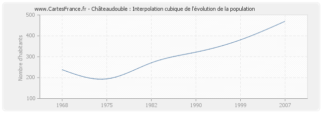 Cette courbe reprend l'historique de la population de Châteaudouble de 1968 à 2007 en interpolation cubique. Ceci permet d'obtenir plus précisément la population de la commune de Châteaudouble les années ou aucun recensement n'a été effectué.