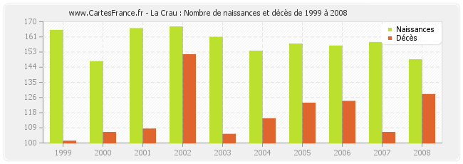 La Crau : évolution des naissances et décès de 1968 à 2007