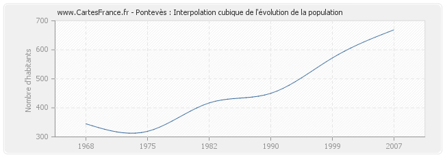 Cette courbe reprend l'historique de la population de Pontevès de 1968 à 2007 en interpolation cubique. Ceci permet d'obtenir plus précisément la population de la commune de Pontevès les années ou aucun recensement n'a été effectué.
