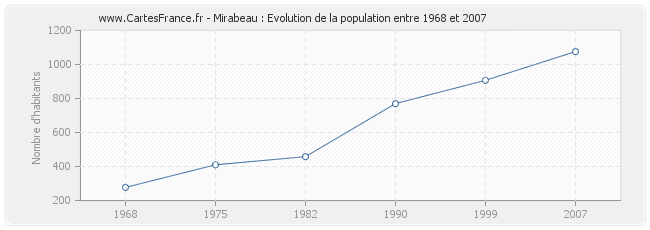 La population de Mirabeau était de 1 076 habitants en 2007, 907 habitants en 1999, 770 habitants en 1990, 458 habitants en 1982, 410 habitants en 1975 et 277 habitants en 1968.