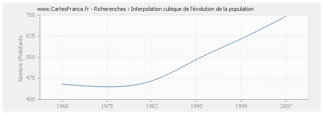Cette courbe reprend l'historique de la population de Richerenches de 1968 à 2007 en interpolation cubique. Ceci permet d'obtenir plus précisément la population de la commune de Richerenches les années ou aucun recensement n'a été effectué.
