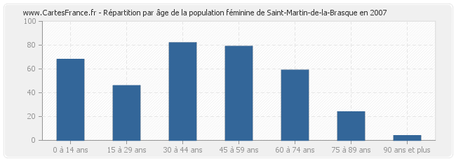 Répartition de la population féminine de Saint-Martin-de-la-Brasque par âge en 2007 :
