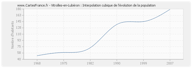 Cette courbe reprend l'historique de la population de Vitrolles-en-Lubéron de 1968 à 2007 en interpolation cubique. Ceci permet d'obtenir plus précisément la population de la commune de Vitrolles-en-Lubéron les années ou aucun recensement n'a été effectué.