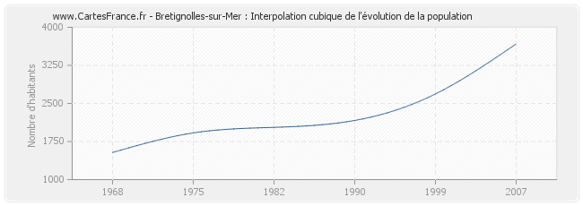 Cette courbe reprend l'historique de la population de Bretignolles-sur-Mer de 1968 à 2007 en interpolation cubique. Ceci permet d'obtenir plus précisément la population de la commune de Bretignolles-sur-Mer les années ou aucun recensement n'a été effectué.