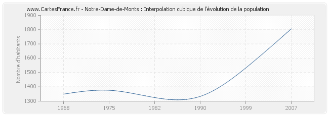 Cette courbe reprend l'historique de la population de Notre-Dame-de-Monts de 1968 à 2007 en interpolation cubique. Ceci permet d'obtenir plus précisément la population de la commune de Notre-Dame-de-Monts les années ou aucun recensement n'a été effectué.